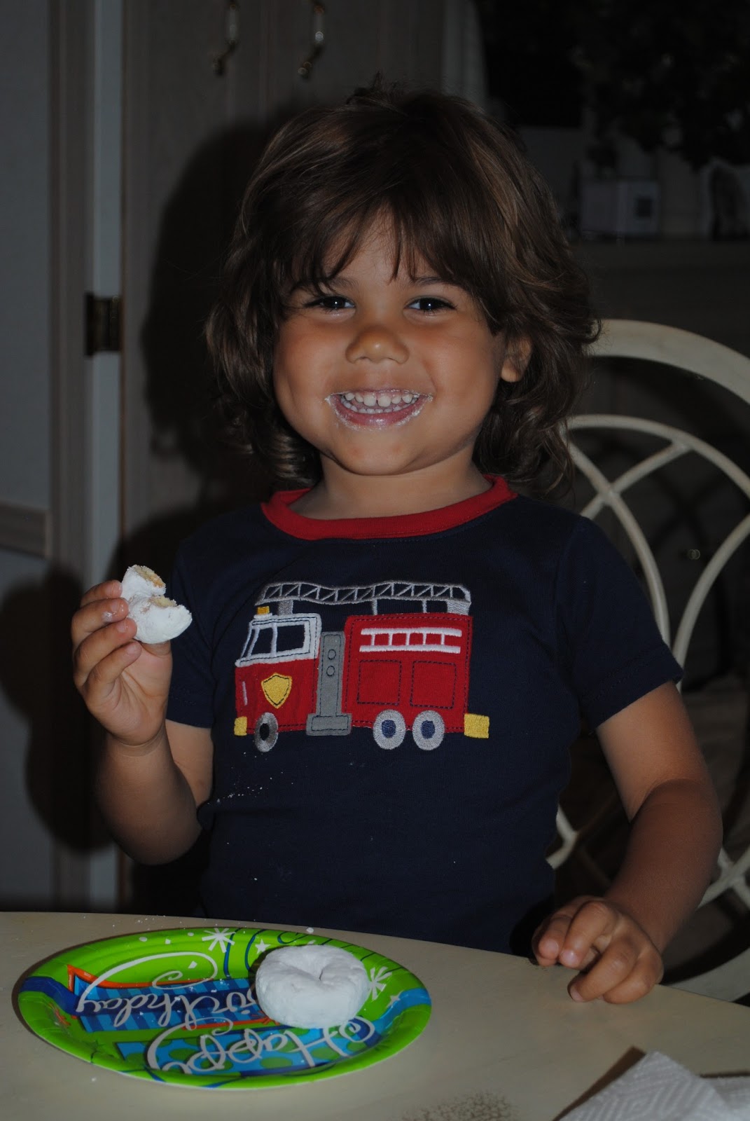 We usually do pancakes in the shape of the number/age they are. A little difficult at the condo, so we settled on a treat - mini powdered donuts w/ a "5" candle! Obviously, they were okay w/ this compromise.